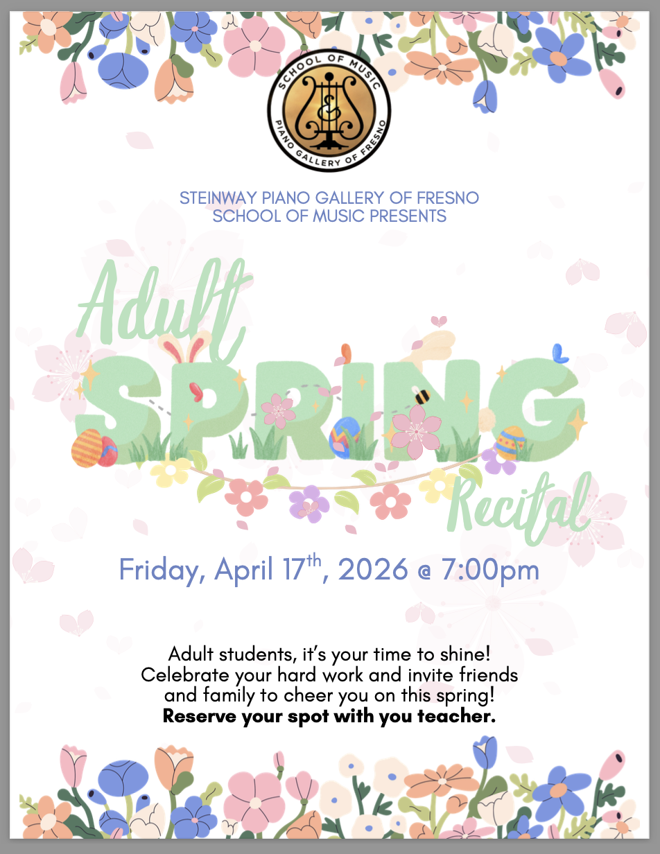 Our Adult Spring Recital is a special evening dedicated to celebrating the dedication, courage, and growth of our adult students. This performance is a chance to showcase months of hard work in a supportive, encouraging environment surrounded by friends, family, and fellow music lovers.